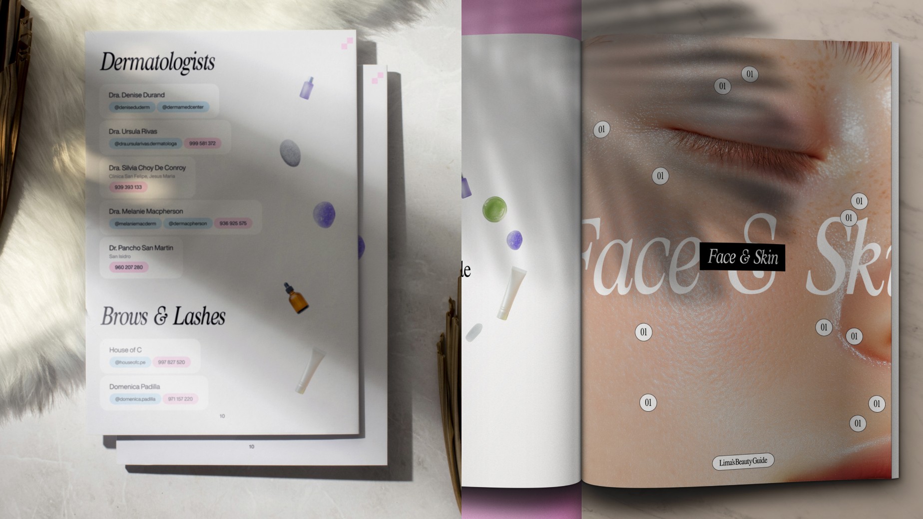 Diseño editorial para una revista que le pertenece a una marca llamada The Beauty Bible. Aquí me pidieron diseñar toda la estructura visual de la revista, junto con algunas visuales que compensaran el contenido. Aunque el producto final sería digital, los mockups sirvieron mucho para darle vida a las páginas.